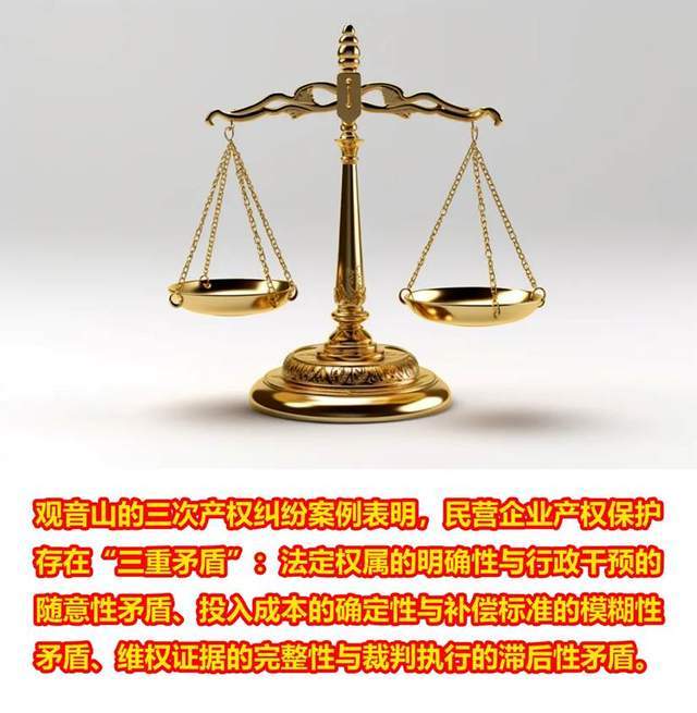 观音山的三次产权纠纷案例表明,民营企业产权保护存在“三重矛盾”:法定权属的明确性与行政干预的随意性矛盾、投入成本的确定性与补偿标准的模糊性矛盾、维权证据的完整性与裁判执行的滞后性矛盾。这要求产权保护必须从“形式确权”走向“实质保障”: