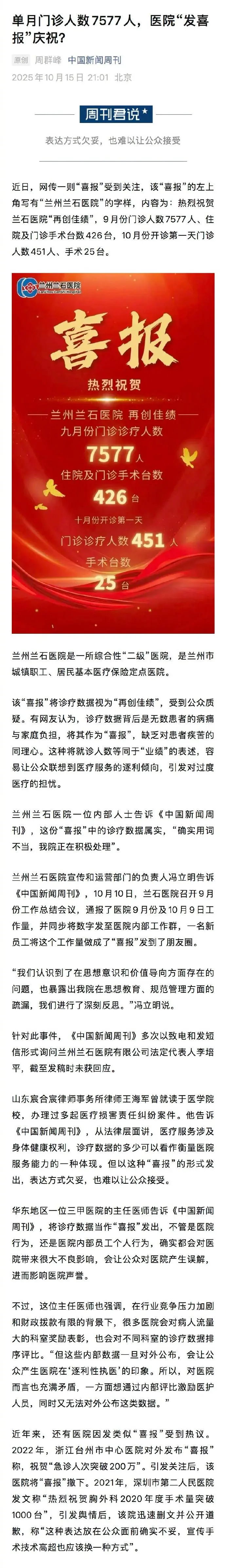 兰州兰石医院宣传和运营部门的负责人冯立明告诉@中国新闻周刊 ,10月10日,兰石医院召开9月份工作总结会议,通报了医院9月份及10月9日工作量,并同步将数字发至医院内部工作群,一名新员工将这个工作量做成了“喜报”发到了朋友圈。“我们认识到了在思想意识和价值导向方面存在的问题,也暴露出我院在思想教育、规范管理方面的疏漏,我们进行了深刻反思。”冯立明说。
