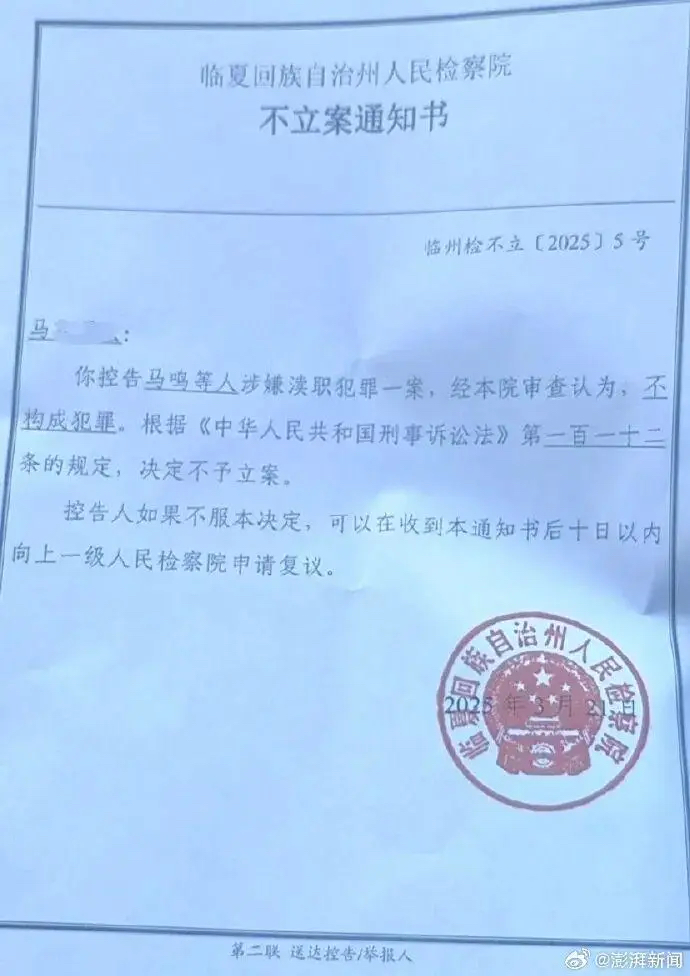 2025年3月,针对马建强控告马某等人涉嫌渎职犯罪一案,临夏州检察院决定不予立案,“经本院审查认为,不构成犯罪”。此后,马建强申请复议。