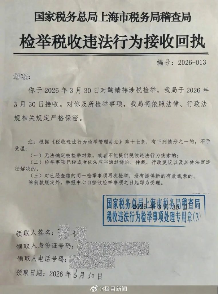 3月31日上午,三张实名检举税收违法行为的函件在社交平台登陆热搜。函件显示,有人在3月30日于国家税务总局上海市税务局稽查局实名举报艺人鞠婧祎。