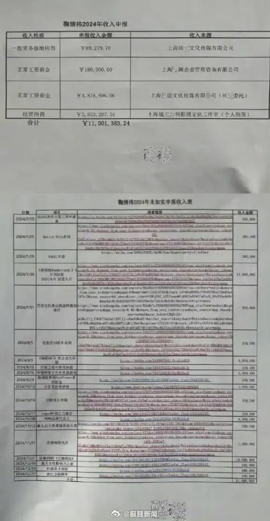 极目新闻记者注意到,名为“实名举报信”上的内容显示,实名举报者提到,鞠婧祎在2024年全年申报收入1100余万元纳税,但“仅2024年6月-12月期间,鞠婧祎参加的影视、商务等活动就不下20多项,保守估计收入不少于5000万。”举报人称,鞠婧祎瞒报比率近88%。